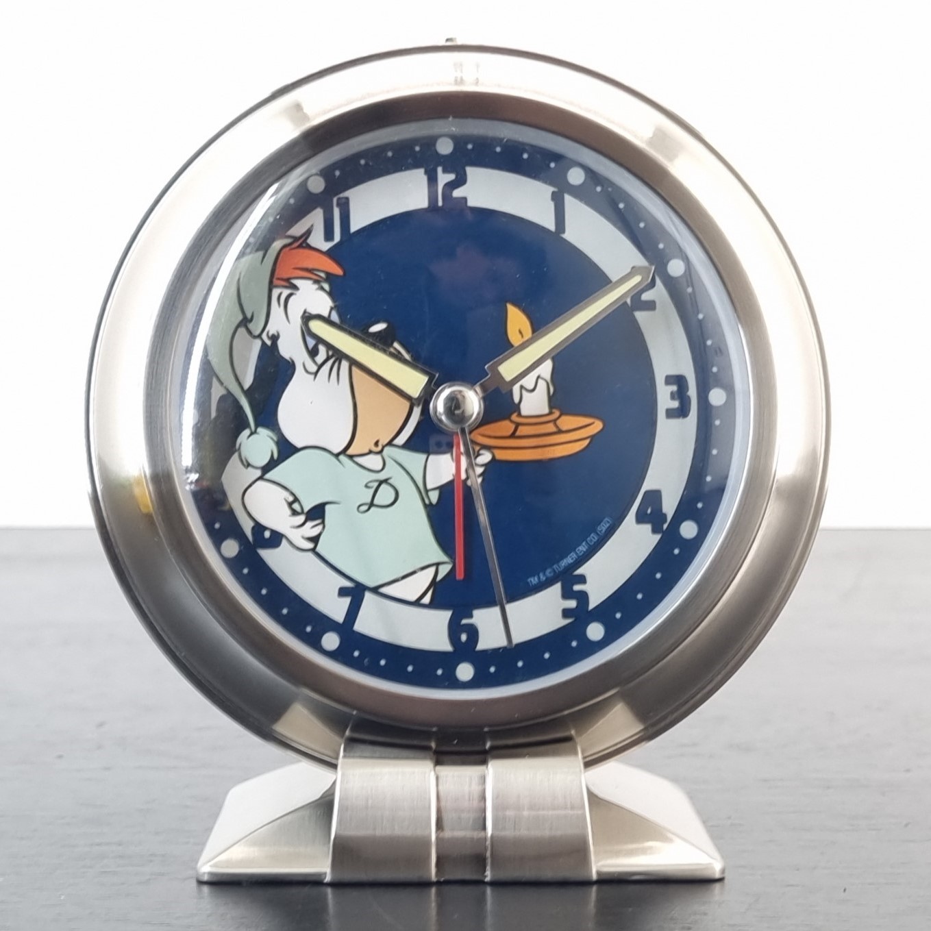 Demons et Merveilles has produced this vintage Droopy alarm clock in the year 2002. This pre-loved Tex Avery alarm clock is about 14 centimeters high and comes with the original box. The condition of this vintage Droopy clock is excellent. Demons et Merveilles produced this Droopy collectible clock in high quality Metal and in license of Turner Entertainment. Droopy is a Tex Avery character.