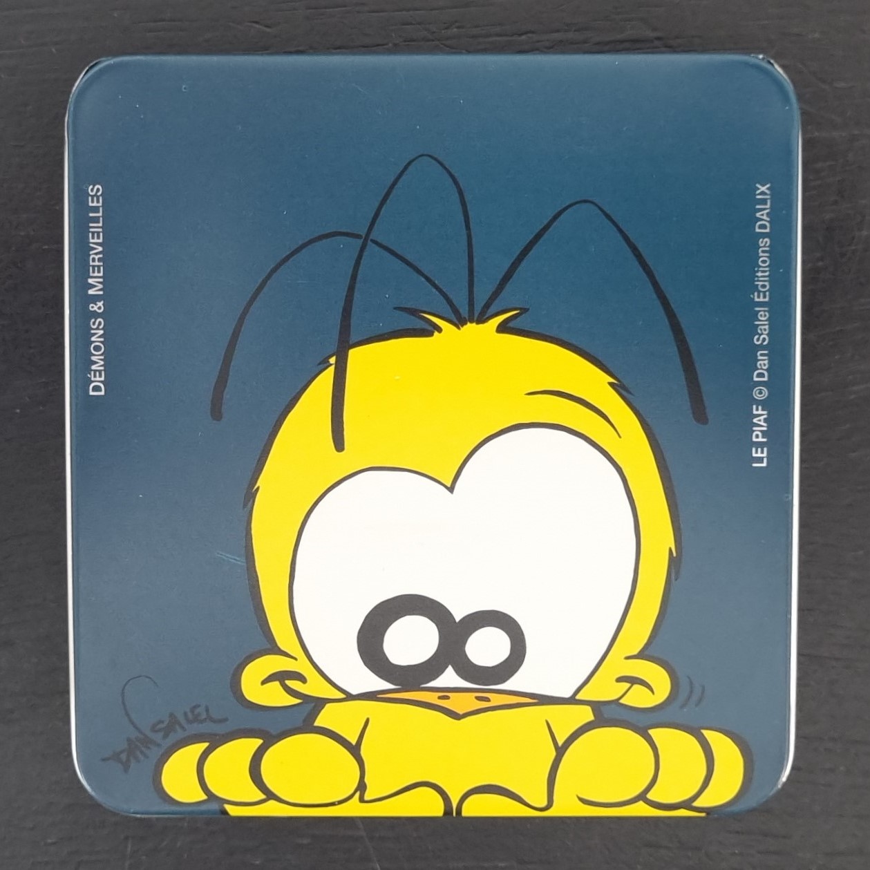Demons et Merveilles has produced this vintage Le Piaf tin box in the year 2001. This pre-loved Le Piaf collectible is about 1.5 centimeters high. The condition of this vintage tin box is excellent. Shows minimal wear, as can be expected from a utensil of this material and age. Demons et Merveilles produced this collectible tin box in high quality Metal and in license of Dan Salel.