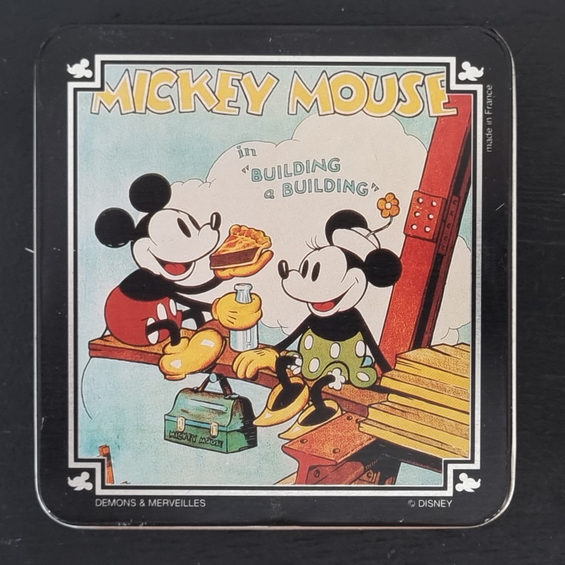 Amazing, vintage tin box of your favorite Walt Disney characters; Mickey and Minnie Mouse. Based on the Walt Disney Classic Cartoon; Building a Building.