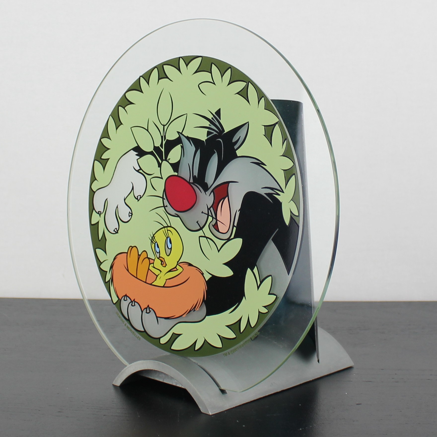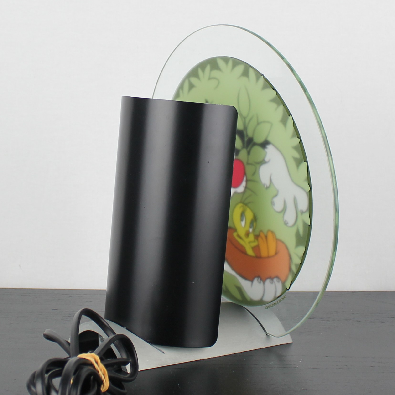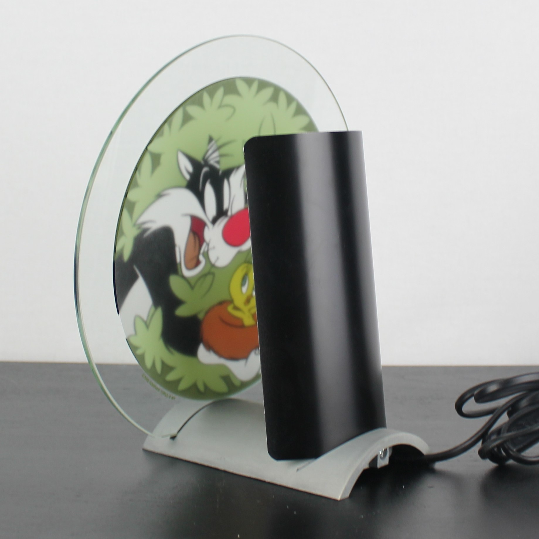 Demons et Merveilles has produced this vintage Sylvester the Cat and Tweety Bird table lamp in the year 2001. This pre-loved Looney Tunes lamp is about 24 centimeters high and comes with the original box. The condition of this Sylvester the Cat and tweety Bird lamp is excellent. Demons et Merveilles produced this collectible lamp in high quality Metal and Glass in license of Warner Bros. Sylvester the Cat and Tweety Bird are Looney Tunes characters.